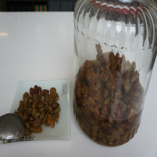 3、.約放置七天的時間,讓白葡萄乾將琴酒完全吸收。 (過程中可以攪拌,以加速琴酒的吸收)